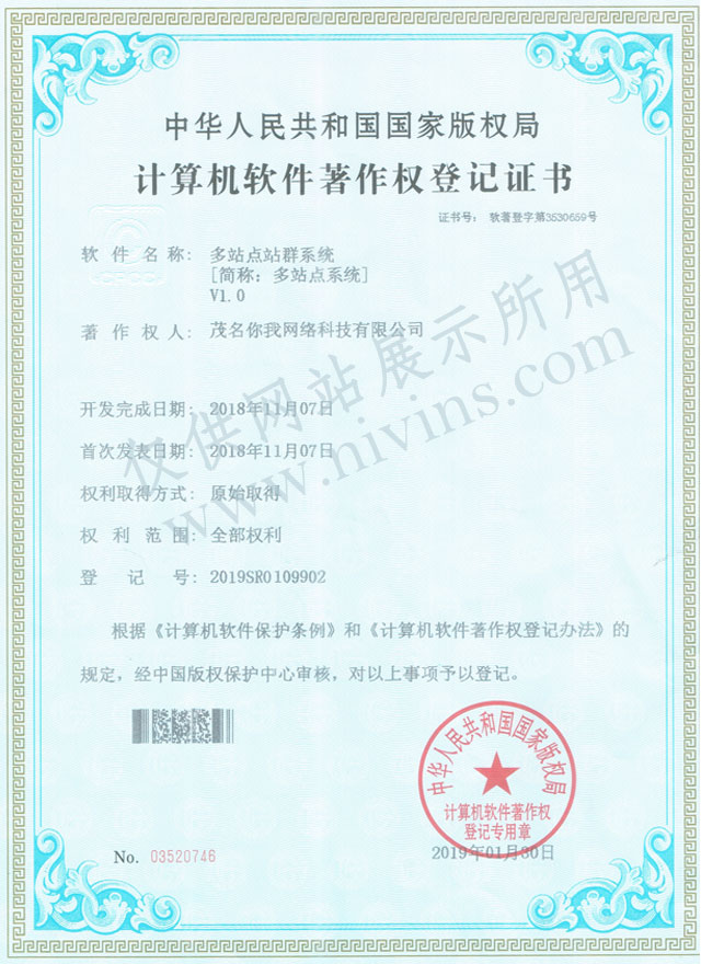 熱烈祝賀茂名你我網(wǎng)絡(luò)科技有限公司獲得了中華人民共和國(guó)國(guó)家版權(quán)局頒發(fā)的《計(jì)算機(jī)軟件著作權(quán)登記證書》,被認(rèn)定為軟件——“多站點(diǎn)站群系統(tǒng)V1.0”的法定著作權(quán)人,登記號(hào):2019SR0109902,證書號(hào):軟著登字第3530659號(hào)。