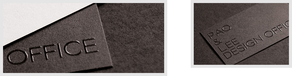 用質(zhì)地較硬的材料制成凹陷或隆起的中間版,通過凸版機(jī)械加工或凹陷或隆起的立體效果,使名片更具有視覺審美效果。通常有無色凹凸,印色凹凸等。